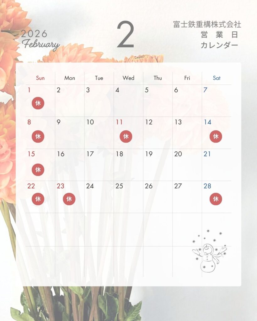 さて、2026年2月の休業日について、上記カレンダーのとおりご案内申し上げます。